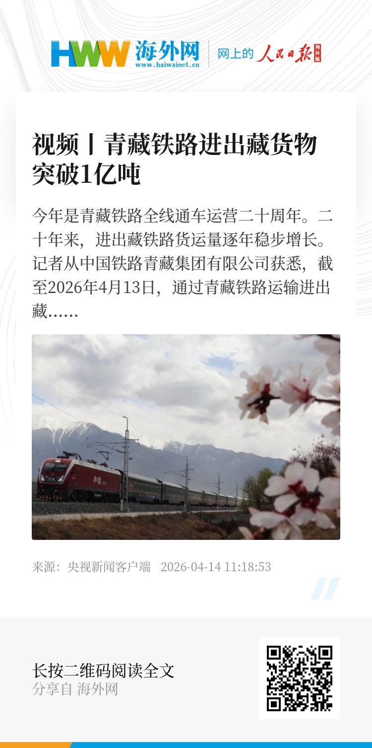 今年是青藏铁路全线通车运营二十周年。二十年来,进出藏铁路货运量逐年稳步增长。记者从中国铁路青藏集团有限公司获悉,截至2026年4月13日,通过青藏铁路运输进出藏货物总量突破1亿吨。青藏铁路货运完成了从最初的“保供需求”到如今“提质增效”的变迁,为西藏经济社会更好发展提供了交通保障,注入了强劲动力。