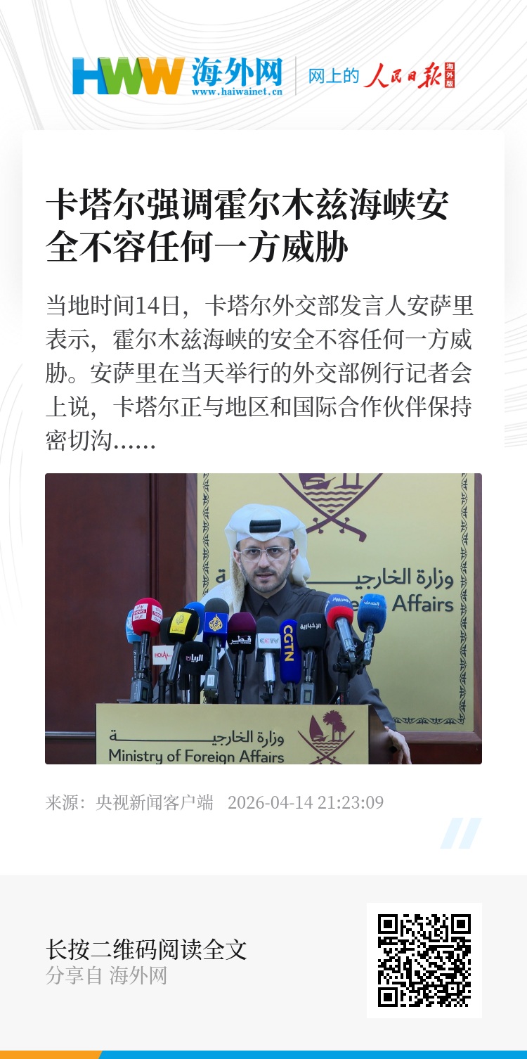 当地时间14日,卡塔尔外交部发言人安萨里表示,霍尔木兹海峡的安全不容任何一方威胁。
