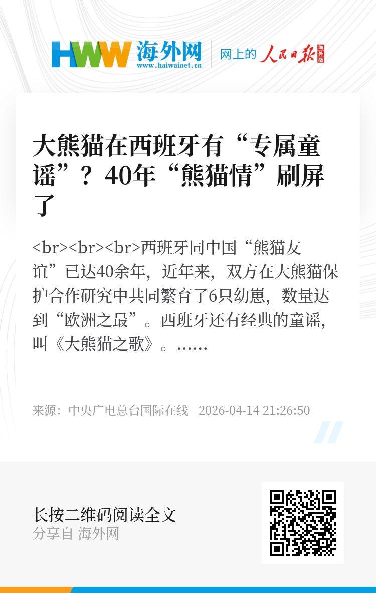 西班牙同中国“熊猫友谊”已达40余年,近年来,双方在大熊猫保护合作研究中共同繁育了6只幼崽,数量达到“欧洲之最”。西班牙还有经典的童谣,叫《大熊猫之歌》。“熊猫情”已成为两国民间友好的重要象征。专家表示,这些生动而有温度的故事,体现出两国人民对于真善美的坚定信念、坚定守护和坚定追求。(记者丨林维 制作丨杨海鹏 签审丨王鑫 监制丨蔡耀远)