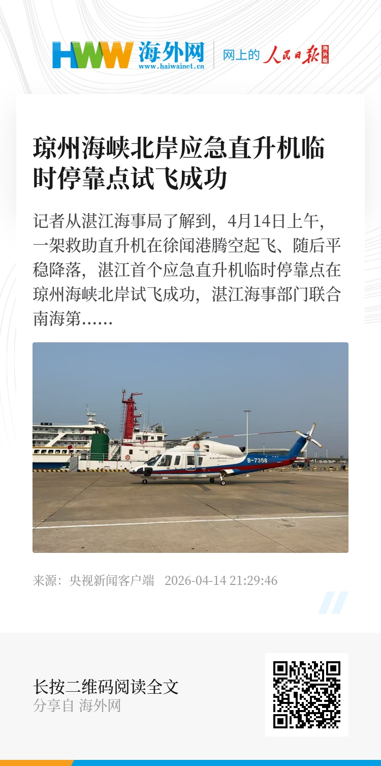 记者从湛江海事局了解到,4月14日上午,一架救助直升机在徐闻港腾空起飞、随后平稳降落,湛江首个应急直升机临时停靠点在琼州海峡北岸试飞成功,湛江海事部门联合南海第一救助飞行队同步开展直升机空中巡查,琼州海峡北岸海上应急救援能力进一步提升。