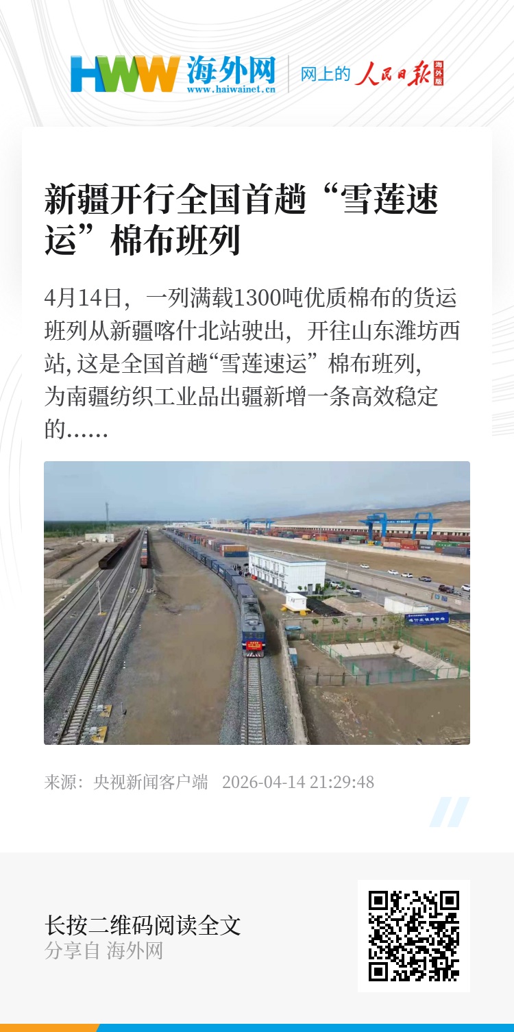 4月14日,一列满载1300吨优质棉布的货运班列从新疆喀什北站驶出,开往山东潍坊西站,这是全国首趟“雪莲速运” 棉布班列,为南疆纺织工业品出疆新增一条高效稳定的常态化铁路物流通道。