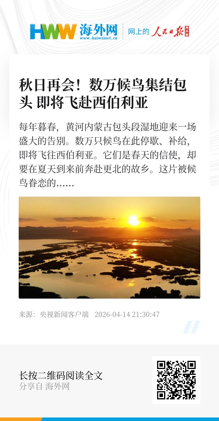 每年暮春,黄河内蒙古包头段湿地迎来一场盛大的告别。数万只候鸟在此停歇、补给,即将飞往西伯利亚。它们是春天的信使,却要在夏天到来前奔赴更北的故乡。这片被候鸟眷恋的湿地是迁徙路上的重要驿站。让我们跟随镜头,向这些即将远行的“老朋友”道一声,一路顺风,秋天见。 (总台记者 赵文俐 张扬 张洁 白杨)