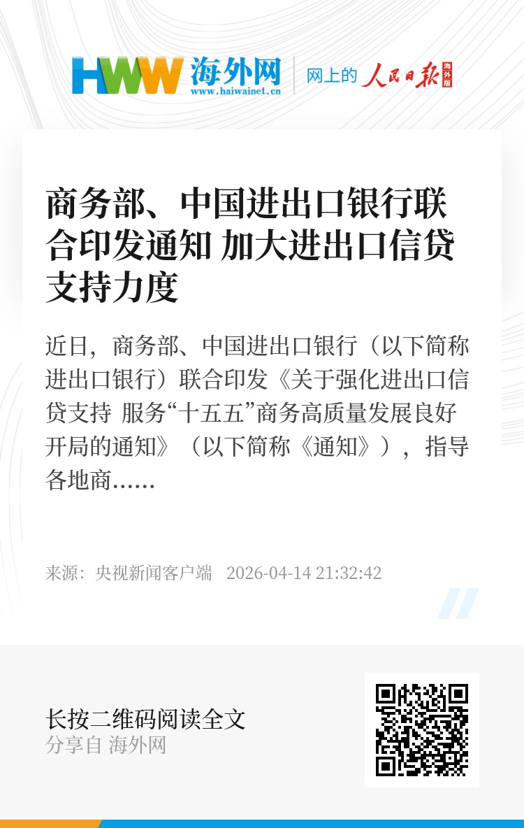 近日,商务部、中国进出口银行(以下简称进出口银行)联合印发《关于强化进出口信贷支持 服务“十五五”商务高质量发展良好开局的通知》(以下简称《通知》),指导各地商务主管部门和进出口银行各分行加强协作联动,加大进出口信贷支持力度,加快推动商务高质量发展,服务“十五五”良好开局。