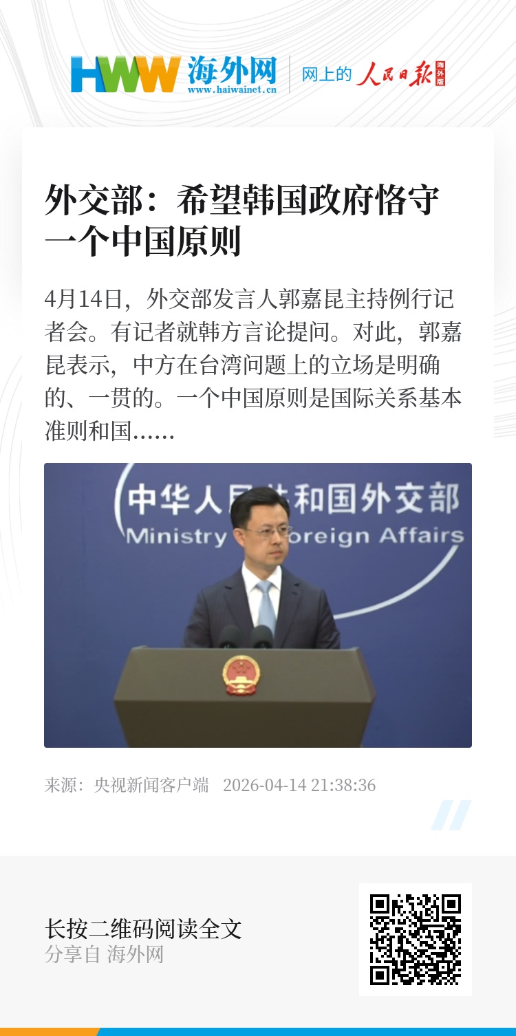 4月14日,外交部发言人郭嘉昆主持例行记者会。有记者就韩方言论提问。
