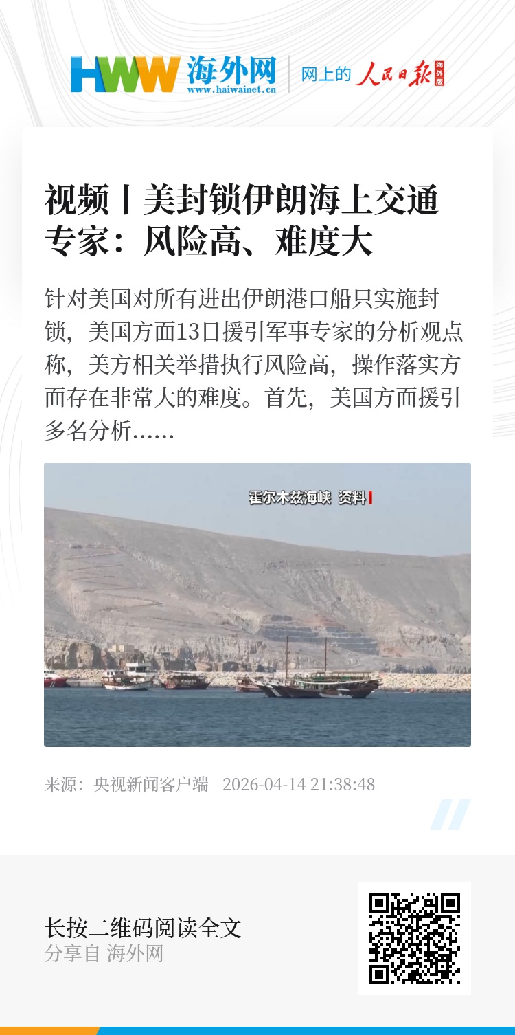 针对美国对所有进出伊朗港口船只实施封锁,美国方面13日援引军事专家的分析观点称,美方相关举措执行风险高,操作落实方面存在非常大的难度。
