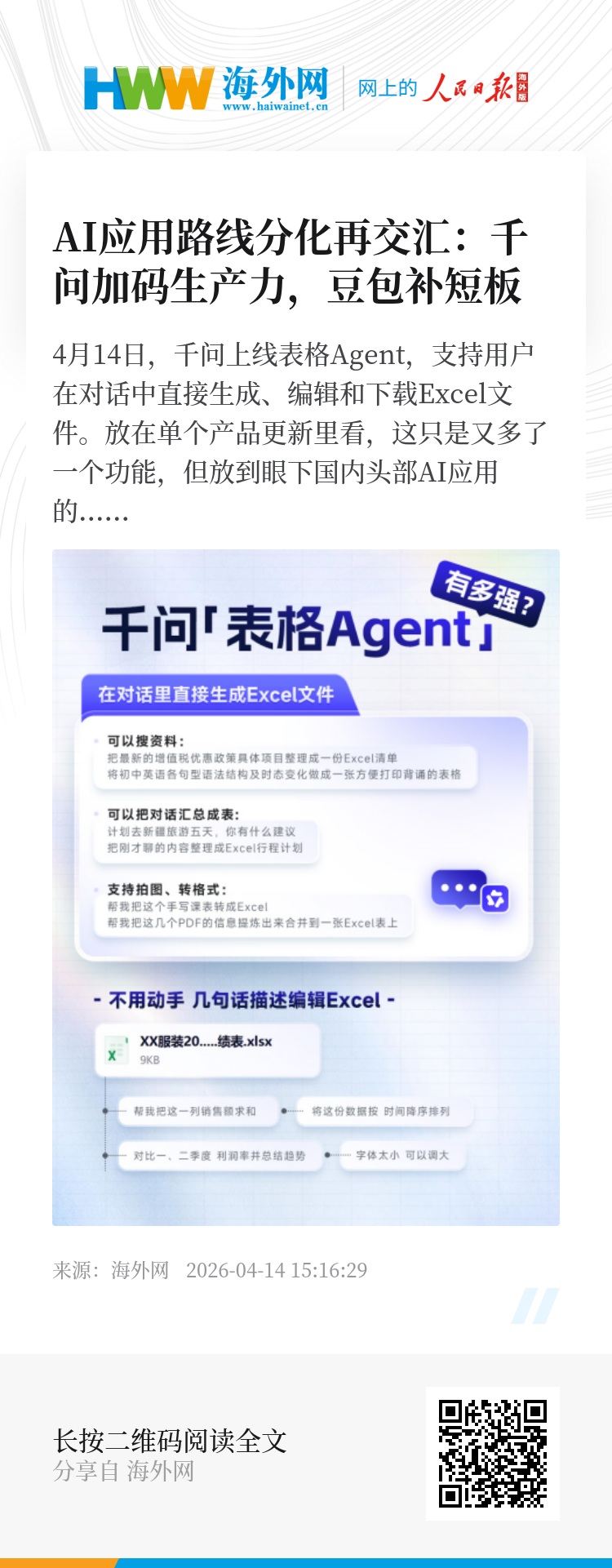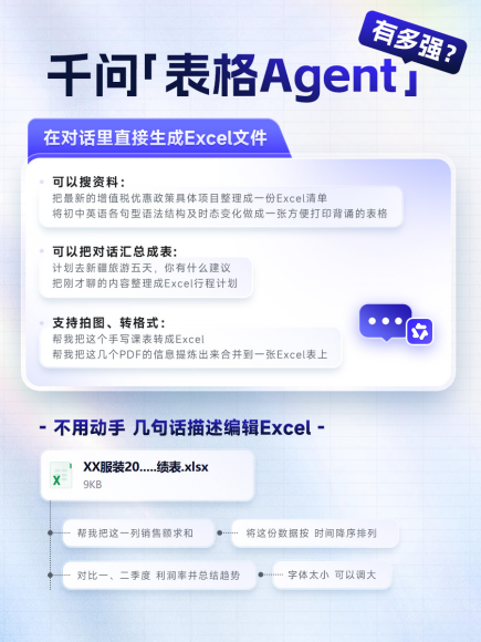 4月14日,千问上线表格Agent,支持用户在对话中直接生成、编辑和下载Excel文件。放在单个产品更新里看,这只是又多了一个功能,但放到眼下国内头部AI应用的竞争格局里看,这是千问在生产力场景上的继续加码。