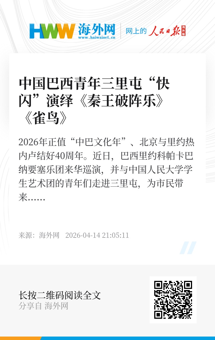 2026年正值“中巴文化年”、北京与里约热内卢结好40周年。近日,巴西里约科帕卡巴纳要塞乐团来华巡演,并与中国人民大学学生艺术团的青年们走进三里屯,为市民带来一场中巴音乐快闪活动。