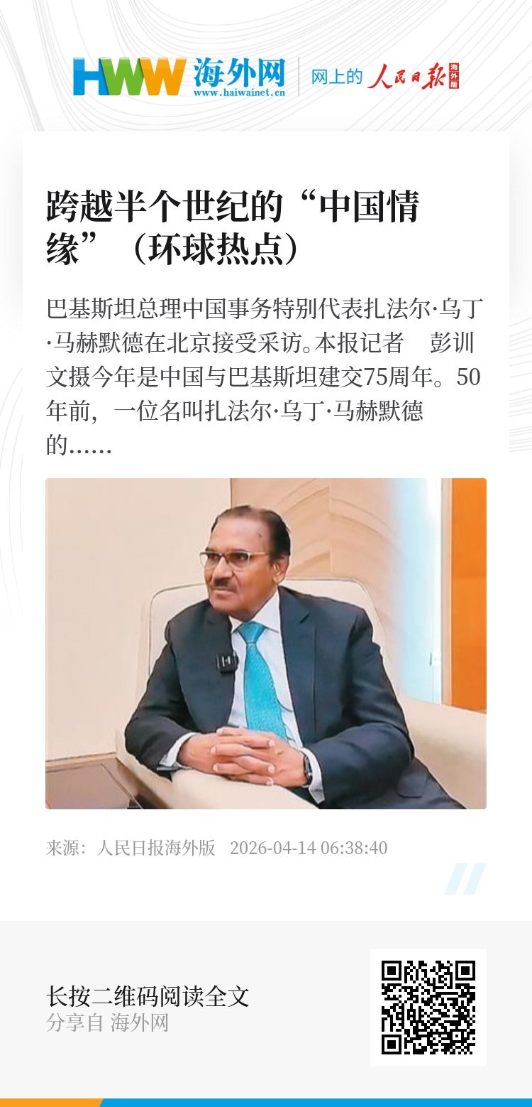 今年是中国与巴基斯坦建交75周年。50年前,一位名叫扎法尔·乌丁·马赫默德的巴基斯坦青年来到中国留学,毕业后选择留在中国,从事对华投资和贸易工作。他先后担任巴基斯坦驻华使馆经济商务参赞、驻上海总领事、中巴经济走廊特使等职,现任巴基斯坦总理中国事务特别代表、博鳌亚洲论坛秘书长政策顾问、巴基斯坦“读懂中国”论坛理事长。