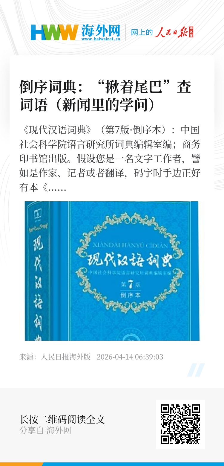 至于“外例”,从全球发展来看,倒序词典是国际通行的辞书类型。自16世纪以来,德语、拉丁语、英语、古希腊语、俄语、法语、西班牙语等语种均有专业倒序词典问世,多用于语言研究、词汇教学与文本分析。