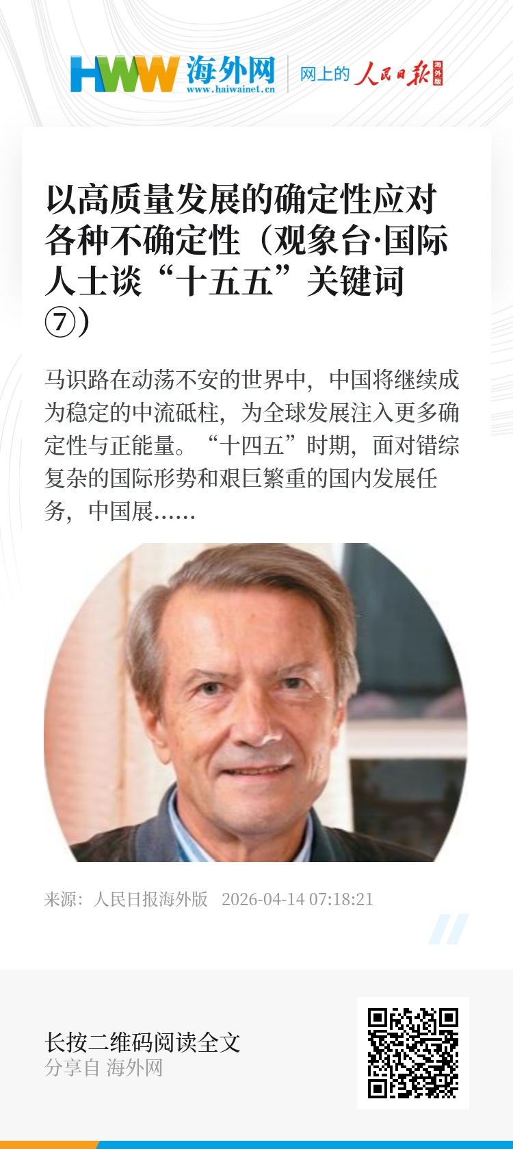 “十五五”规划纲要中有句话,“以高质量发展的确定性应对各种不确定性”,给我留下了深刻印象。在动荡不安的世界中,中国将继续成为稳定的中流砥柱,以高质量发展为主线,以创新驱动为核心,以绿色转型为底色,以高水平开放为路径,为全球发展注入更多确定性与正能量。