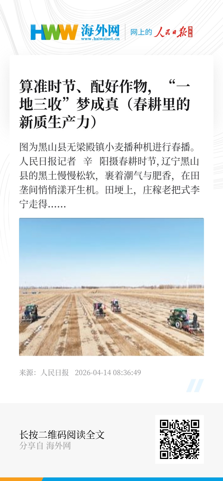 “2026年,黑山县本地‘一地三收’要扩到20万亩,跨区域推广落地总面积达到50万亩。”李宁说,越来越多农户主动加入“一地三收”。