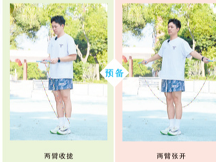 摆动与起跳:双手自然握住绳柄末端,掌心相对,大拇指与食指捏住跳绳手柄的前端,其他3根手指后贴手柄,手腕稍微朝外展开。手腕保持灵活,避免握太紧或太松,确保绳子能随手腕转动自然摆动。以手腕为轴,带动绳子向前摆动,避免大臂发力。绳子即将落地时,双脚同时轻轻向上起跳,高度以刚好避开绳子为宜(3—5厘米);落地时,前脚掌先着地,膝盖顺势缓冲,减少对关节的冲击。