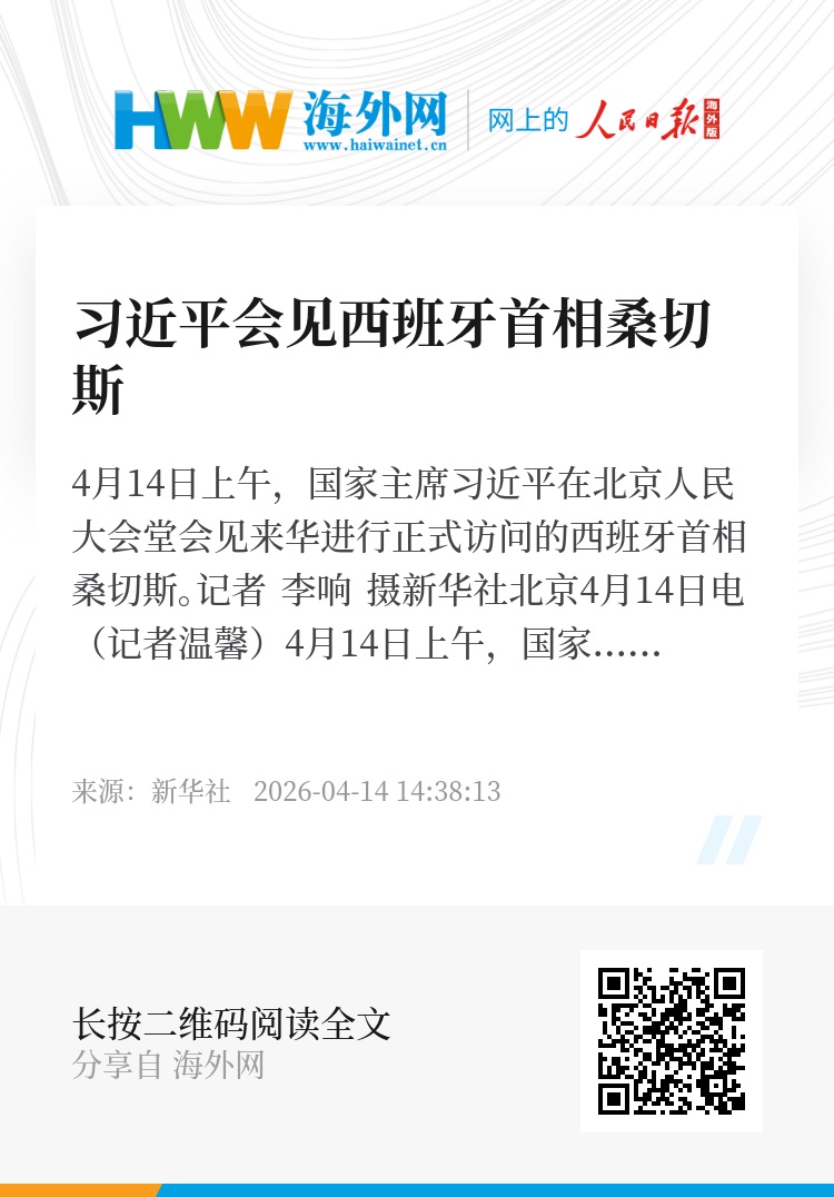 新华社北京4月14日电(记者温馨)4月14日上午,国家主席习近平在北京人民大会堂会见来华进行正式访问的西班牙首相桑切斯。