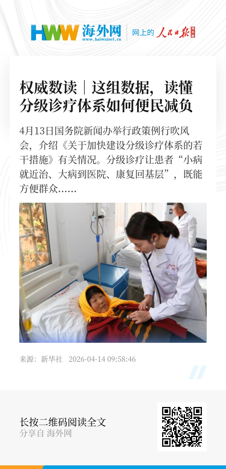 4月13日国务院新闻办举行政策例行吹风会,介绍《关于加快建设分级诊疗体系的若干措施》有关情况。分级诊疗让患者“小病就近治、大病到医院、康复回基层”,既能方便群众就医,又降低了就医负担。跟随海报,一起了解分级诊疗体系如何便民减负。