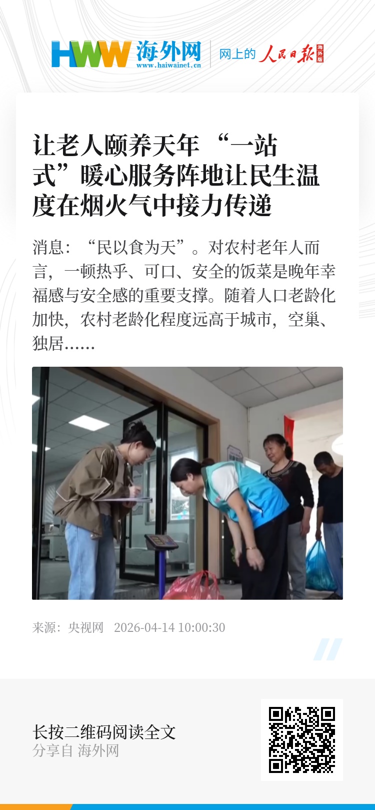 央视网消息:“民以食为天”。对农村老年人而言,一顿热乎、可口、安全的饭菜是晚年幸福感与安全感的重要支撑。随着人口老龄化加快,农村老龄化程度远高于城市,空巢、独居、失能老人逐年增多,“做饭难、吃饭难、吃得差”成为农村养老的突出痛点。破解这一民生难题,让农村老年人“食有所依、食有所安、食有所乐”是推进乡村振兴、完善农村养老服务体系的重要课题。