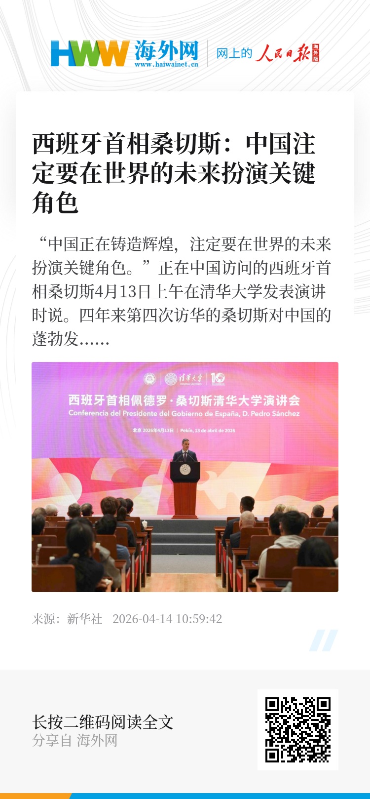 “中国正在铸造辉煌,注定要在世界的未来扮演关键角色。”正在中国访问的西班牙首相桑切斯4月13日上午在清华大学发表演讲时说。
