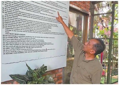 马来西亚槟城战争博物馆创建者佐哈里在展板前介绍日军占领槟城后发布的“38项严令”。