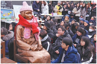 韩国民众在首都首尔一处象征日军“慰安妇”受害者的“和平少女”雕像周围举行抗议活动。