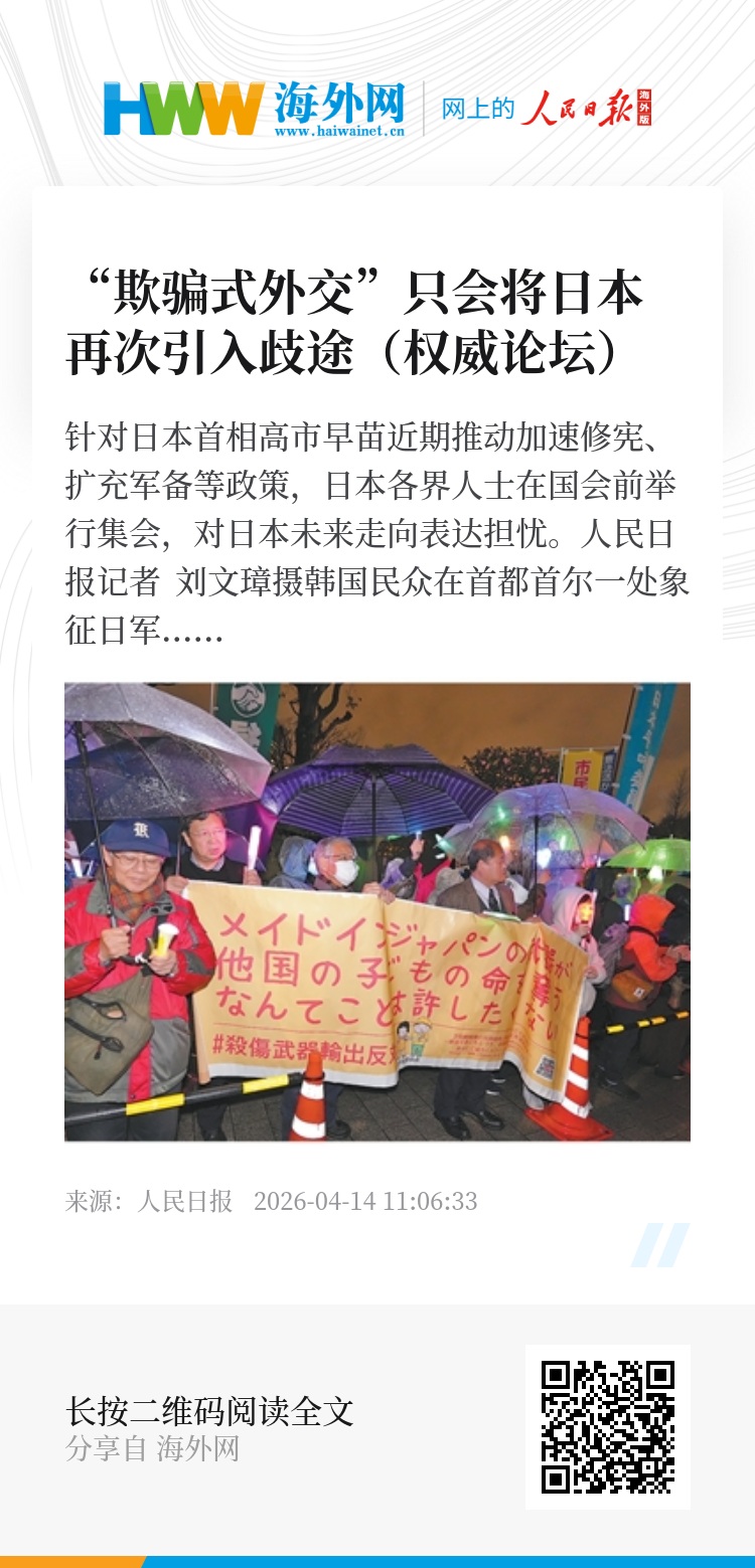 谢尔盖·萨纳科耶夫:日本如今以谎言包装战略野心、延续历史上“和谈掩备战”的伎俩,本质是为摆脱战后秩序、进行军事扩张铺路。日本右翼势力从来就没有放弃成为军事大国的幻想,高市早苗政府极力渲染所谓的“外部威胁”,企图欺骗国内和国际舆论。近年来,日本大幅修订安保政策,不断增加军费,加快推进军事松绑,谋求突破和平宪法,在“新型军国主义”的漩涡里越陷越深。