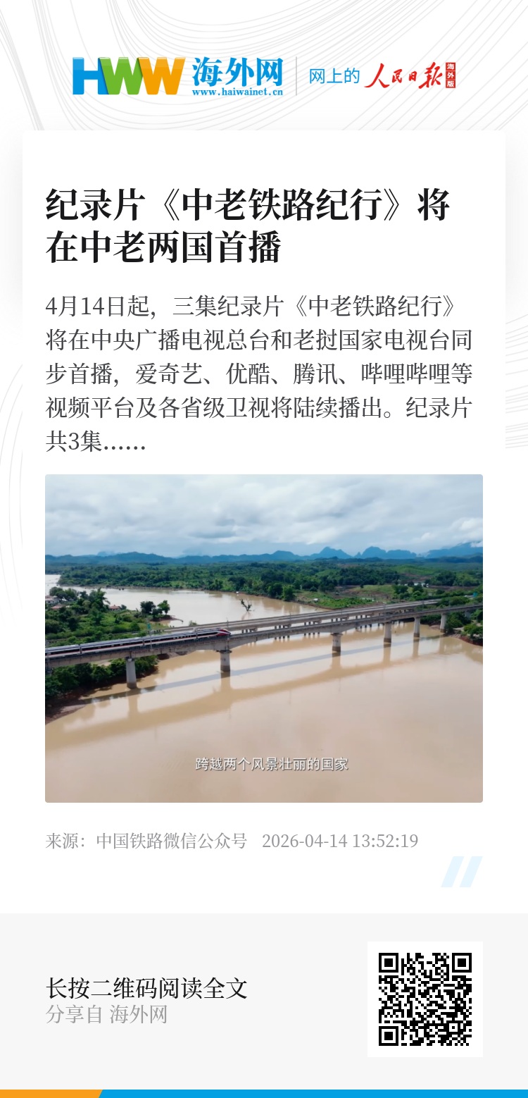 4月14日起,三集纪录片《中老铁路纪行》将在中央广播电视总台和老挝国家电视台同步首播,爱奇艺、优酷、腾讯、哔哩哔哩等视频平台及各省级卫视将陆续播出。