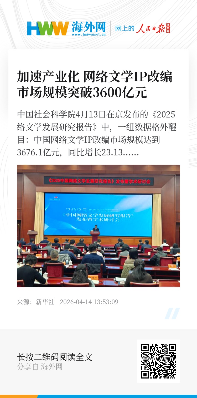 中国社会科学院4月13日在京发布的《2025中国网络文学发展研究报告》中,一组数据格外醒目:中国网络文学IP改编市场规模达到3676.1亿元,同比增长23.13%。这不仅是数字的大幅跃升,更标志着网络文学从“阅读赛道”加速驶入“产业快车道”,成为文化产业不可忽视的力量。