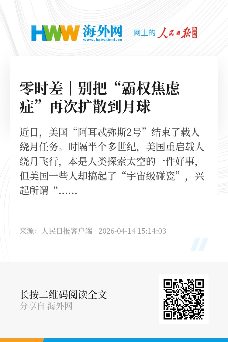 近日,美国“阿耳忒弥斯2号”结束了载人绕月任务。时隔半个多世纪,美国重启载人绕月飞行,本是人类探索太空的一件好事,但美国一些人却搞起了“宇宙级碰瓷”,兴起所谓“中美太空对抗”叙事。仿佛探月本身不是目的,“赢”才有意义。