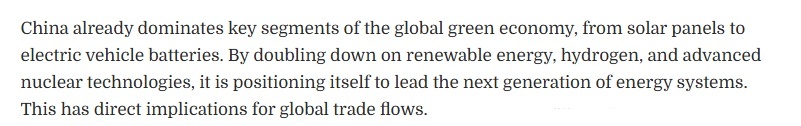文章关注到,该规划纲要将绿色发展置于中国经济转型的核心位置。中国已在全球绿色经济的关键领域占据主导地位,从太阳能电池板到电动汽车电池,无一例外。通过加大对可再生能源、氢能以及先进核能技术的投入,中国正致力于成为下一代能源体系的引领者。这将对全球贸易格局产生直接影响。