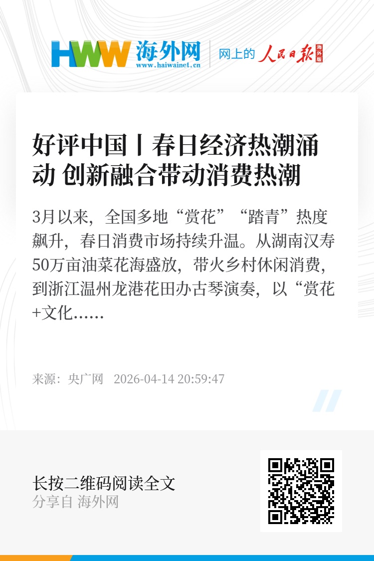 一朵花开,满城芬芳。因为创新融合,让这个春天有了更多打开方式,消费的“新烟火”也持续升腾。未来各地只要因地制宜,以花促游,以游带产,以产焕新,必将推动春日经济不断释放新活力和长效价值。