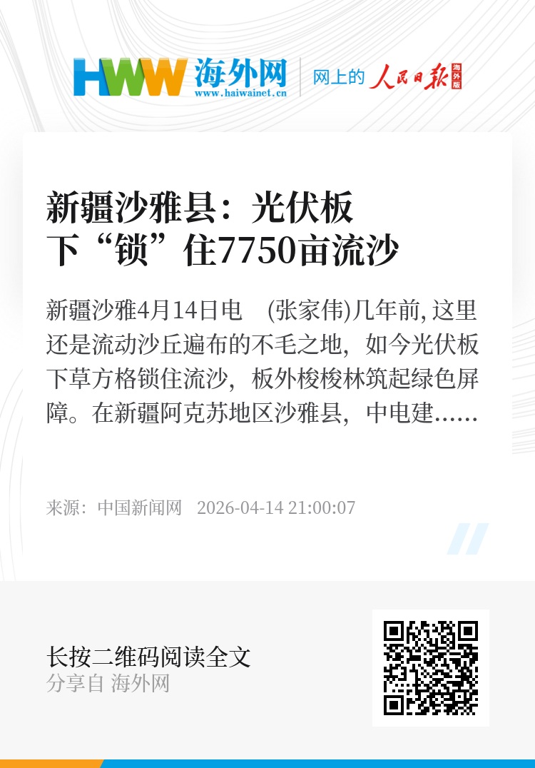 中新网新疆沙雅4月14日电 (张家伟)几年前,这里还是流动沙丘遍布的不毛之地,如今光伏板下草方格锁住流沙,板外梭梭林筑起绿色屏障。