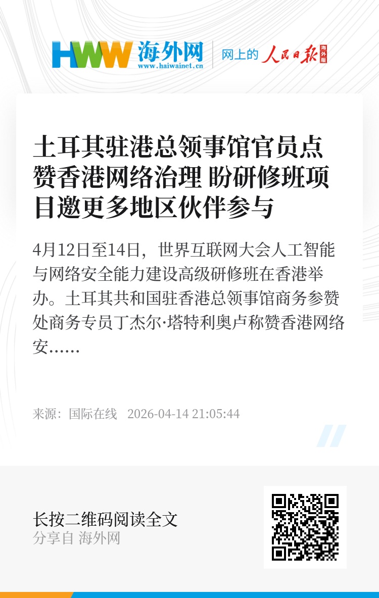 4月12日至14日,世界互联网大会人工智能与网络安全能力建设高级研修班在香港举办。土耳其共和国驻香港总领事馆商务参赞处商务专员丁杰尔·塔特利奥卢称赞香港网络安全治理出色,称在这次活动中看到了飞行技术新成果与数字银行的良好防护。他还表示,期待研修班项目未来能邀请更多地区伙伴共同参与。(陈晓舒 陈鑫涛)