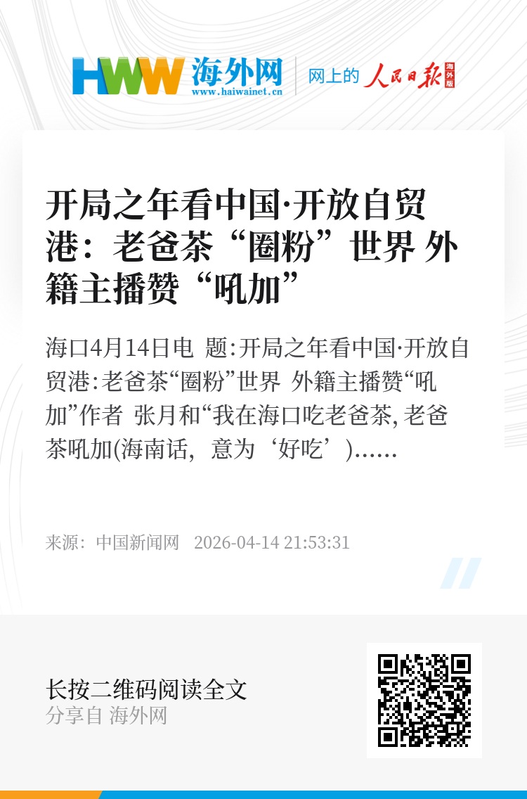 中新网海口4月14日电 题:开局之年看中国·开放自贸港:老爸茶“圈粉”世界 外籍主播赞“吼加”
