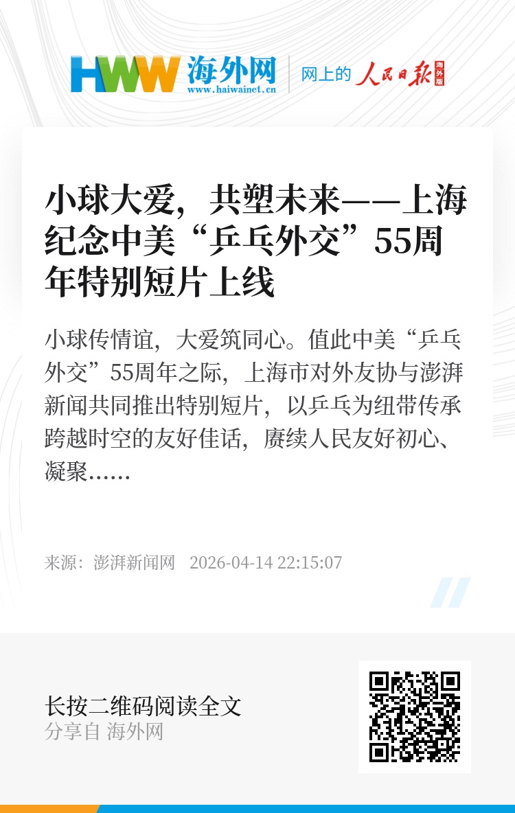 小球传情谊,大爱筑同心。值此中美“乒乓外交”55周年之际,上海市对外友协与澎湃新闻共同推出特别短片,以乒乓为纽带传承跨越时空的友好佳话,赓续人民友好初心、凝聚青年奋进力量,深化中美民间交流互鉴,以小球联结世界、温暖双向奔赴,携手共筑和平包容、合作共赢的美好未来。本短片于4月13日中美“乒乓外交”55周年纪念活动上海欢迎仪式及友谊赛现场展播。