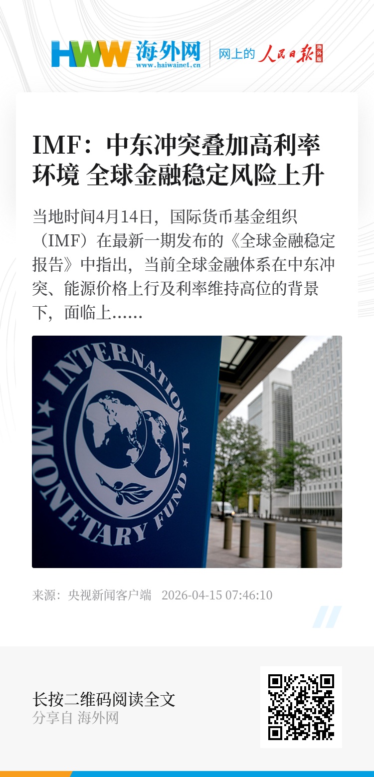 当地时间4月14日,国际货币基金组织(IMF)在最新一期发布的《全球金融稳定报告》中指出,当前全球金融体系在中东冲突、能源价格上行及利率维持高位的背景下,面临上升的稳定性风险。