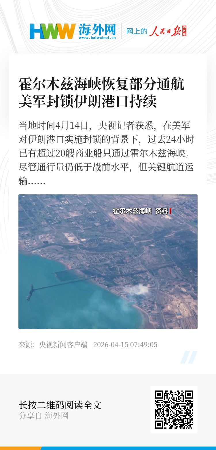 当地时间4月14日,央视记者获悉,在美军对伊朗港口实施封锁的背景下,过去24小时已有超过20艘商业船只通过霍尔木兹海峡。尽管通行量仍低于战前水平,但关键航道运输出现恢复迹象。(央视记者 刘骁骞)