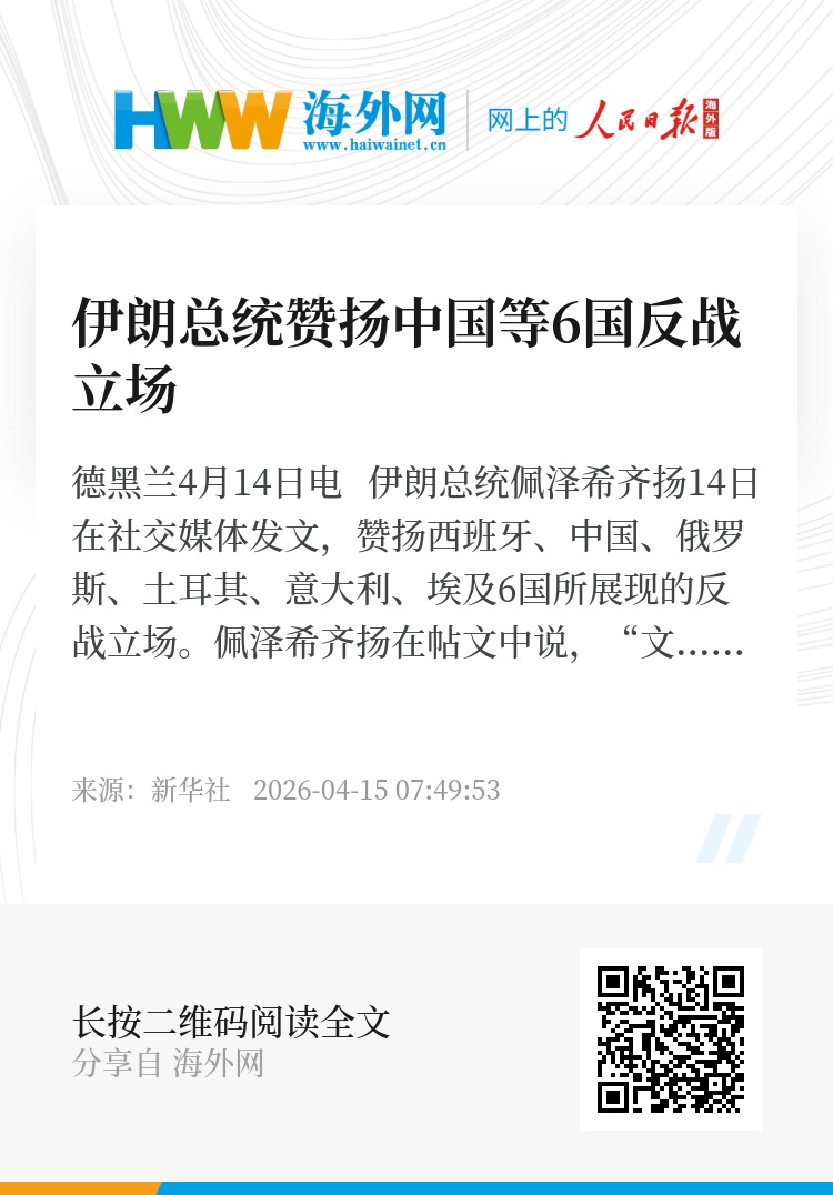 新华社德黑兰4月14日电 伊朗总统佩泽希齐扬14日在社交媒体发文,赞扬西班牙、中国、俄罗斯、土耳其、意大利、埃及6国所展现的反战立场。