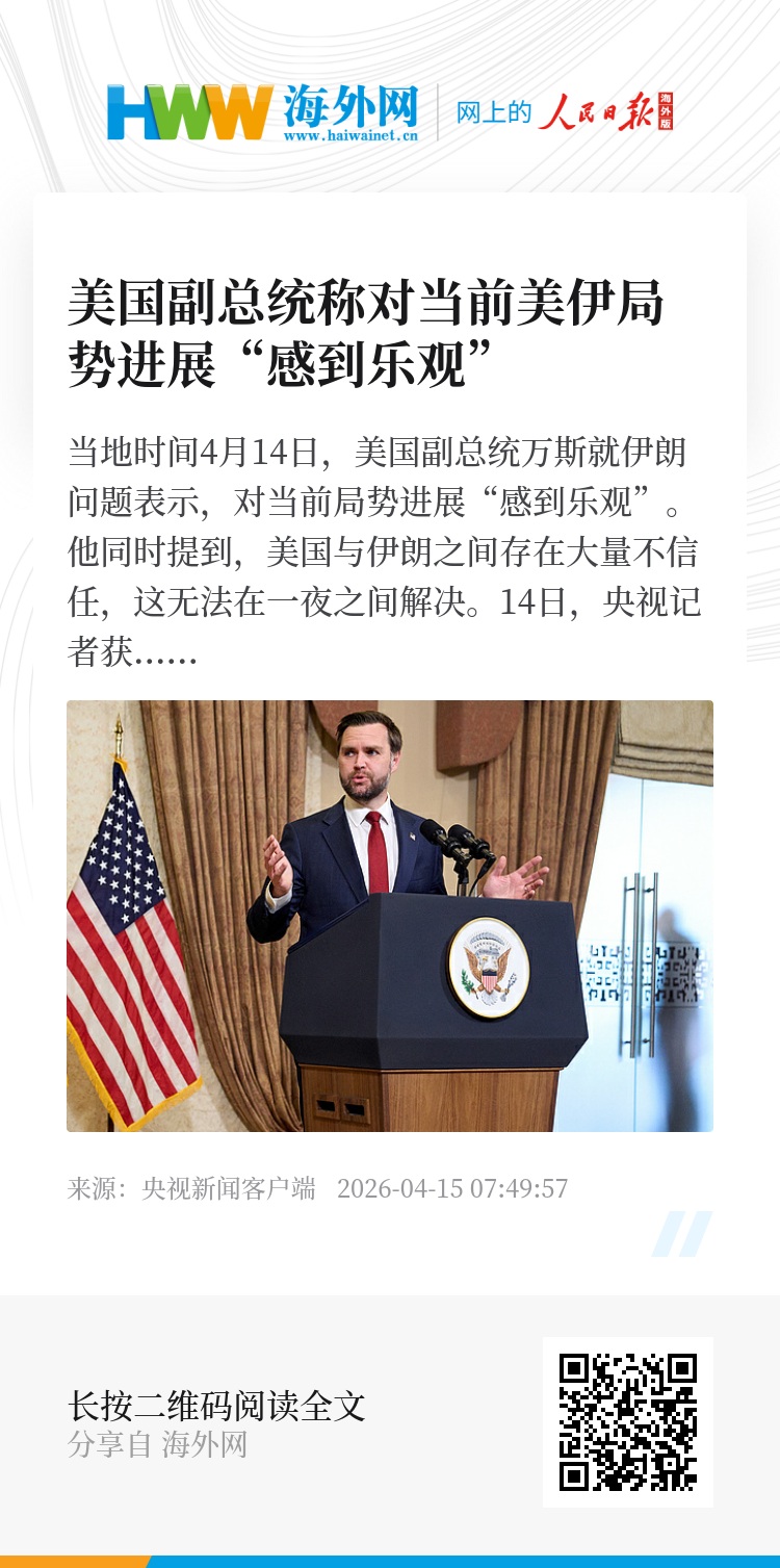 当地时间4月14日,美国副总统万斯就伊朗问题表示,对当前局势进展“感到乐观”。他同时提到,美国与伊朗之间存在大量不信任,这无法在一夜之间解决。