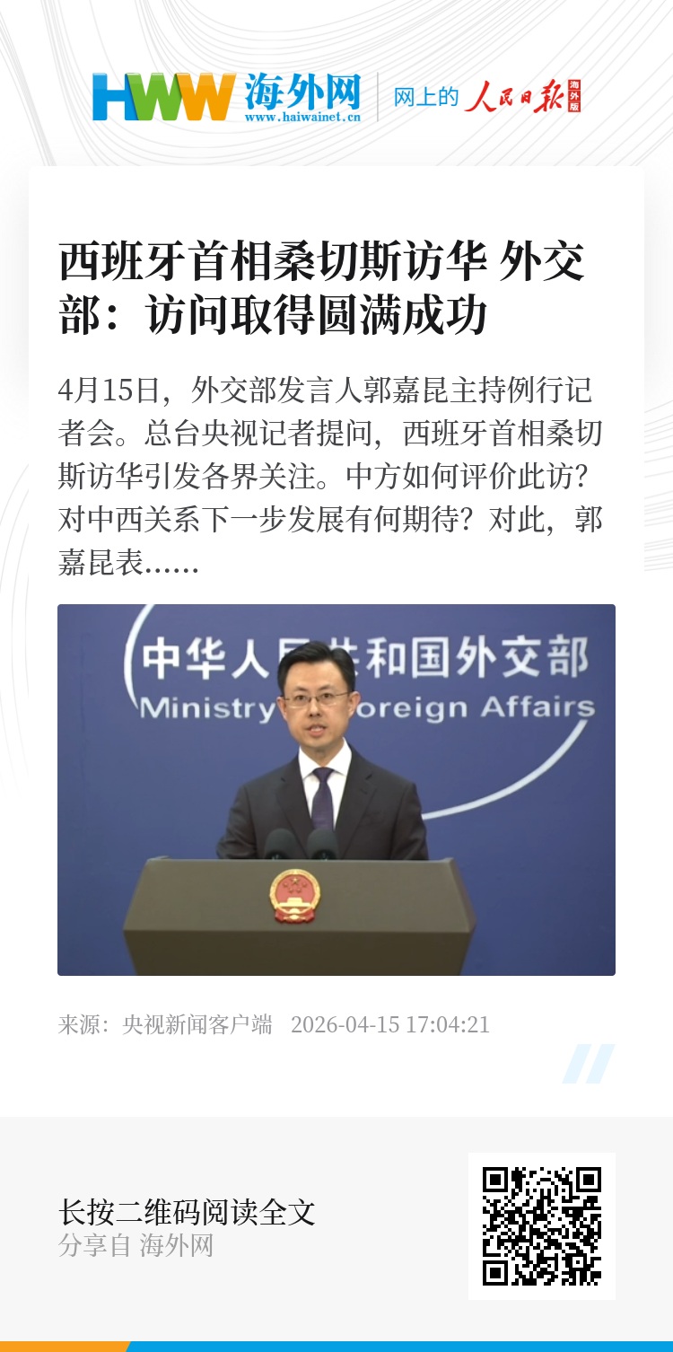 4月15日,外交部发言人郭嘉昆主持例行记者会。总台央视记者提问,西班牙首相桑切斯访华引发各界关注。中方如何评价此访?对中西关系下一步发展有何期待?