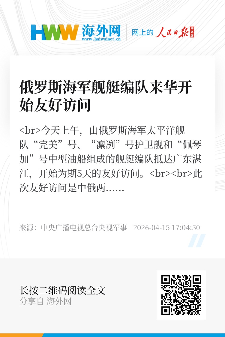 此次友好访问是中俄两国海军例行性友好交流活动,旨在进一步增进友谊互信、深化务实合作,不针对第三方,与当前国际和地区局势无关。