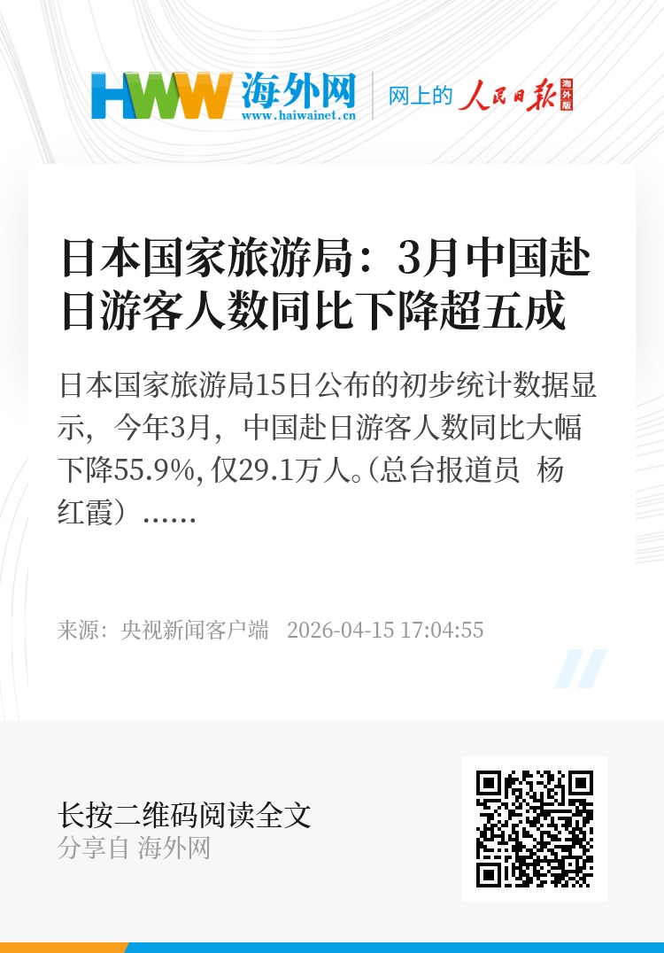 日本国家旅游局15日公布的初步统计数据显示,今年3月,中国赴日游客人数同比大幅下降55.9%,仅29.1万人。(总台报道员 杨红霞)