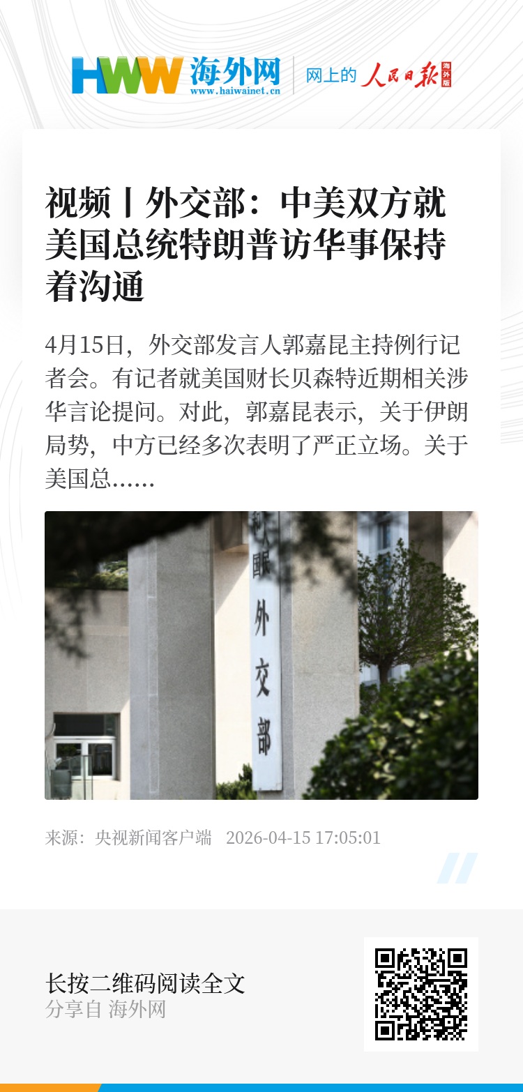 4月15日,外交部发言人郭嘉昆主持例行记者会。有记者就美国财长贝森特近期相关涉华言论提问。对此,郭嘉昆表示,关于伊朗局势,中方已经多次表明了严正立场。关于美国总统特朗普访华,双方就此事保持着沟通。