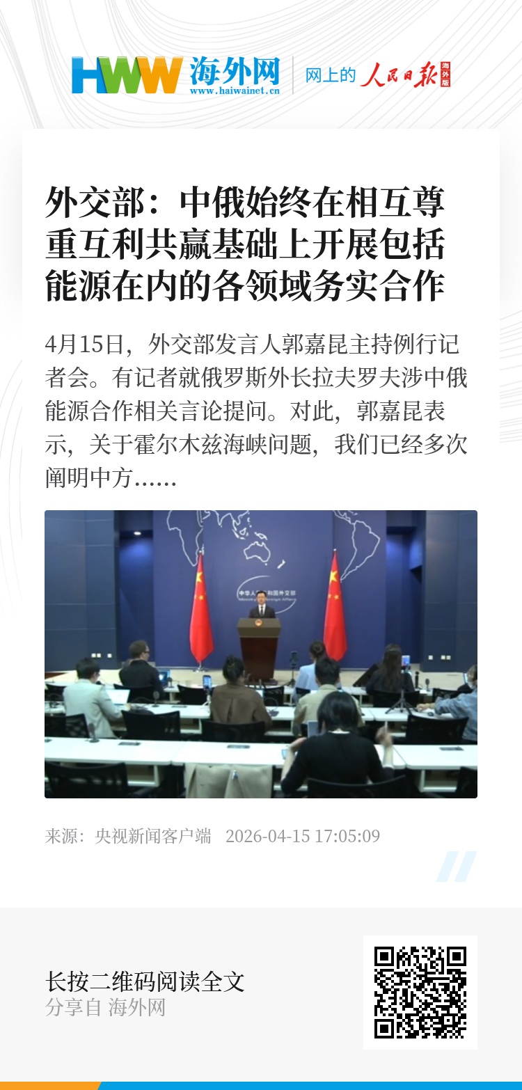 对此,郭嘉昆表示,关于霍尔木兹海峡问题,我们已经多次阐明中方的立场。中俄始终在相互尊重互利共赢基础上,开展包括能源在内的各领域务实合作。
