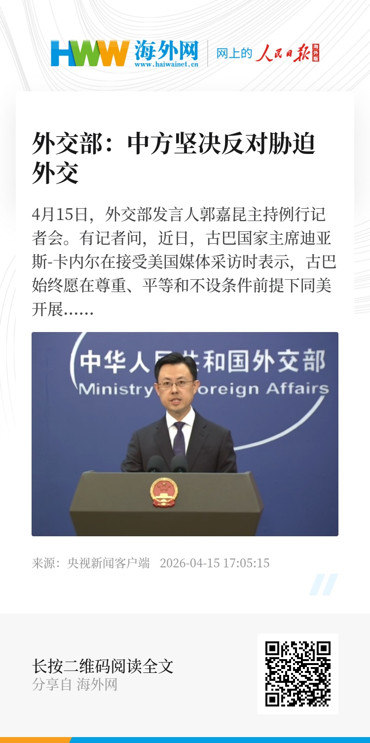 4月15日,外交部发言人郭嘉昆主持例行记者会。有记者问,近日,古巴国家主席迪亚斯-卡内尔在接受美国媒体采访时表示,古巴始终愿在尊重、平等和不设条件前提下同美开展对话,坚决拒绝美国要求其辞职等政治要价。古不对美国构成威胁,美国没有任何理由诉诸军事侵略。13日,美国再次对古发出威胁,称美可能在伊朗问题结束后处理古巴。中方对此有何评论?