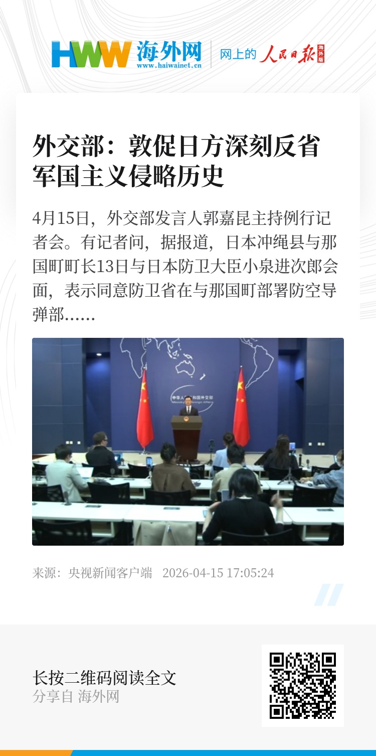 4月15日,外交部发言人郭嘉昆主持例行记者会。有记者问,据报道,日本冲绳县与那国町町长13日与日本防卫大臣小泉进次郎会面,表示同意防卫省在与那国町部署防空导弹部队的计划。请问中方对此有何评论?