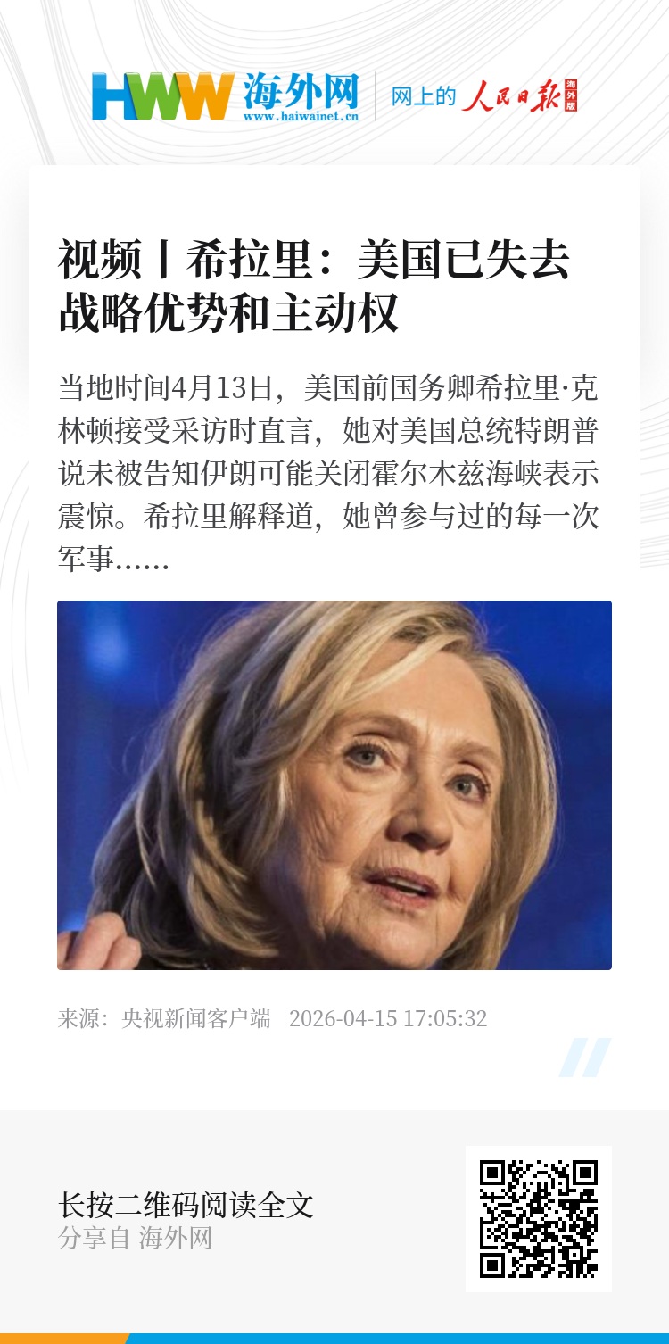 当地时间4月13日,美国前国务卿希拉里·克林顿接受采访时直言,她对美国总统特朗普说未被告知伊朗可能关闭霍尔木兹海峡表示震惊。希拉里解释道,她曾参与过的每一次军事推演中,这始终是美国预判伊朗会首先采取的行动。她表示,美国现在处于一个弱势的局面,基本上失去了战略优势和主动权。