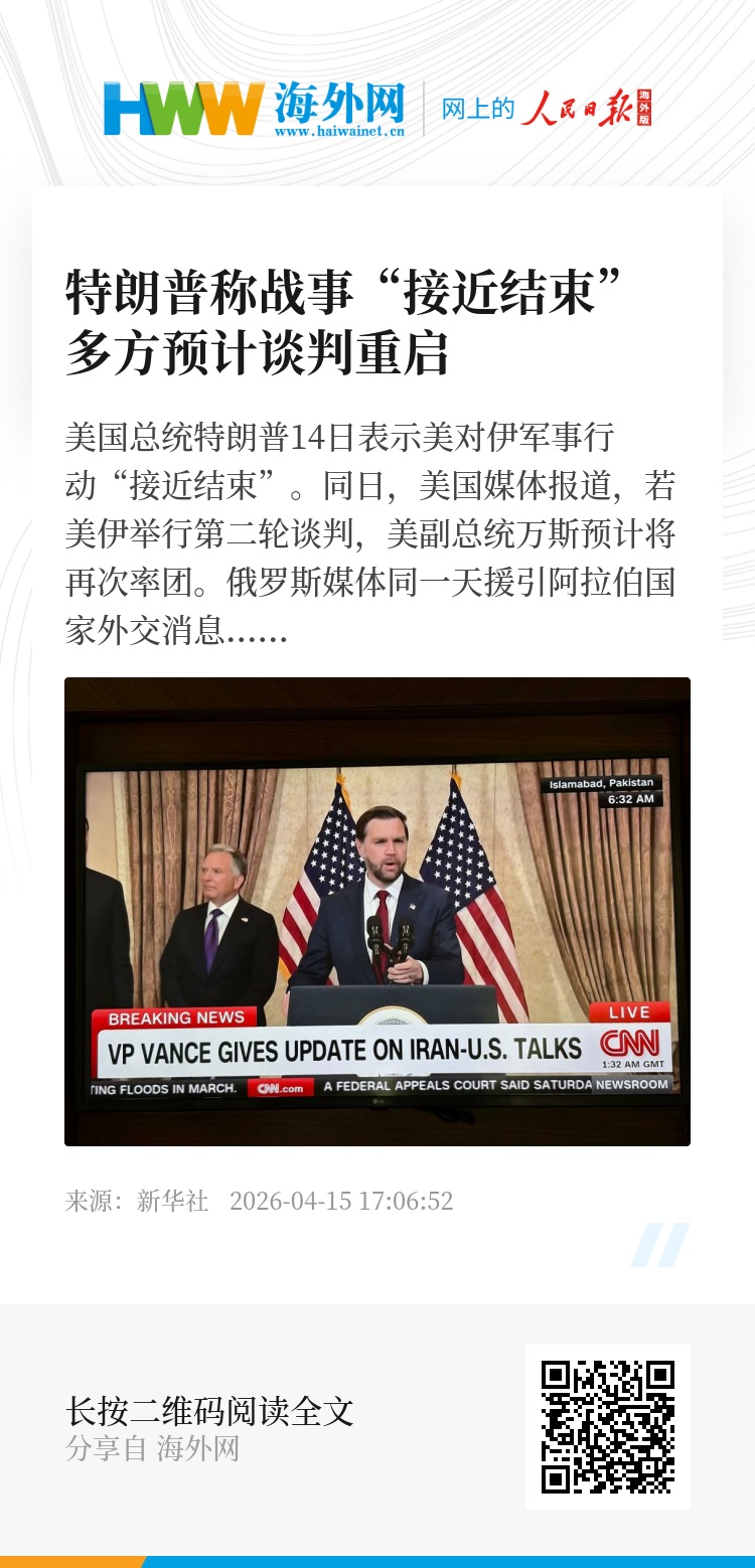 美国总统特朗普14日表示美对伊军事行动“接近结束”。同日,美国媒体报道,若美伊举行第二轮谈判,美副总统万斯预计将再次率团。俄罗斯媒体同一天援引阿拉伯国家外交消息人士的话报道说,有关方正在讨论延长伊朗和美国临时停火的可能性。