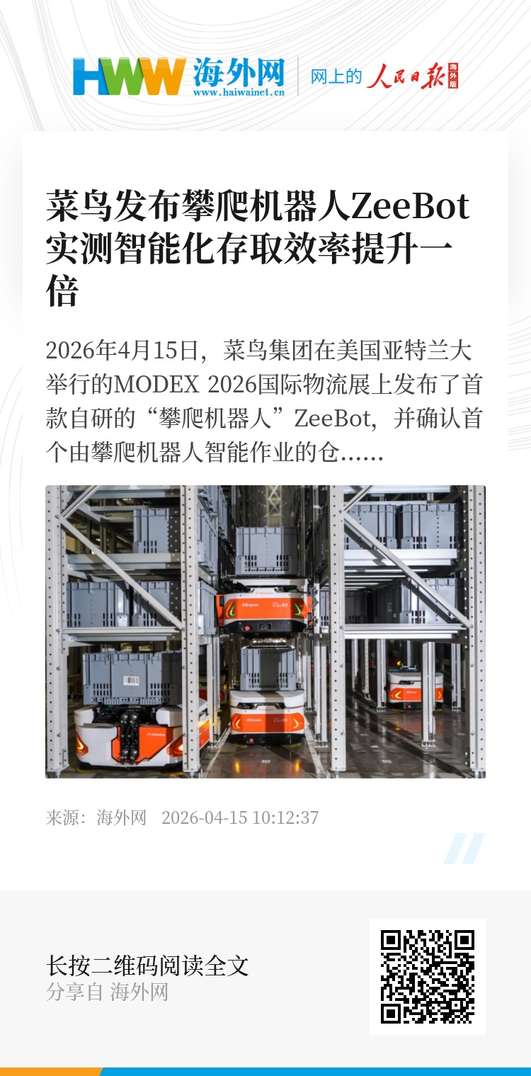 2026年4月15日,菜鸟集团在美国亚特兰大举行的MODEX 2026国际物流展上发布了首款自研的“攀爬机器人”ZeeBot,并确认首个由攀爬机器人智能作业的仓储项目已在广东省交付使用。实测数据显示,该技术使仓库存取效率提升了100%,机器人10秒就能爬上5层楼高的货架。