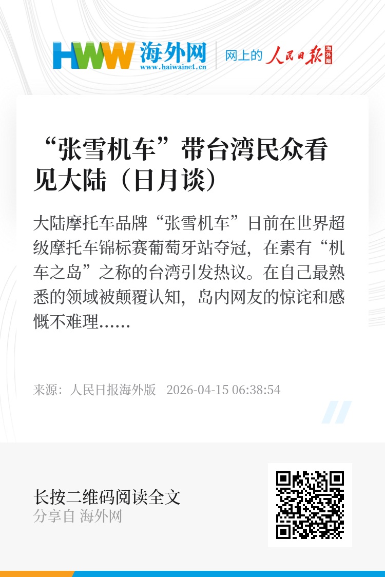 许多台湾网友表示,大陆品牌在国际赛场争气,“大长两岸中国人的志气”。而张雪从一名普通修车学徒到冒雨骑行百公里追梦,再到创立品牌并在国际赛场夺冠,现实版的“飞驰人生”、草根逆袭的奋斗故事也跨越海峡,打动了包括台湾摩托车爱好者在内的许多人。大陆的成就也是台湾的荣耀,大陆的进步更是台湾的福祉。两岸中国人血脉相连、情感相通,彼此走近走亲、相知相惜、携手发展,本是最理所当然的事。(王平)