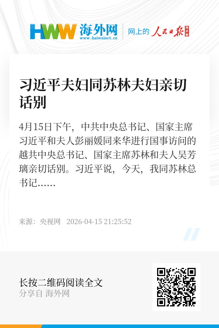 4月15日下午,中共中央总书记、国家主席习近平和夫人彭丽媛同来华进行国事访问的越共中央总书记、国家主席苏林和夫人吴芳璃亲切话别。