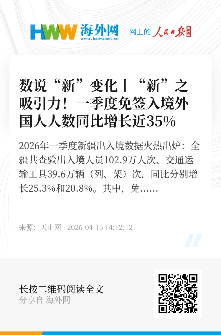 2026年一季度新疆出入境数据火热出炉:全疆共查验出入境人员102.9万人次、交通运输工具39.6万辆(列、架)次,同比分别增长25.3%和20.8%。其中,免签入境外国人达18.1万人次,占入境外国人总数七成以上,同比增长34.9%。免签“朋友圈”扩容,航线越飞越密,带来了“硬核吸引力”;通关更快、手续更简,跑出了“便利加速度”。本期《数说“新”变化》,一同关注。