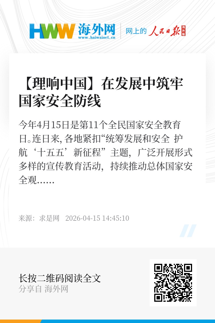 今年4月15日是第11个全民国家安全教育日。连日来,各地紧扣“统筹发展和安全 护航‘十五五’新征程”主题,广泛开展形式多样的宣传教育活动,持续推动总体国家安全观落地见效。京津冀区域联动加强国家安全宣传教育效应,广东启动主题研学活动厚植青少年的家国情怀,合肥在地铁站打造“沉浸式国家安全课堂”……一系列接地气、有温度、重实效的活动,推动国家安全宣传教育更加贴近群众、贴近生活,形成了全域推进、全民参与的良好局面,也让“国家安全就在身边”的理念更加深入人心。